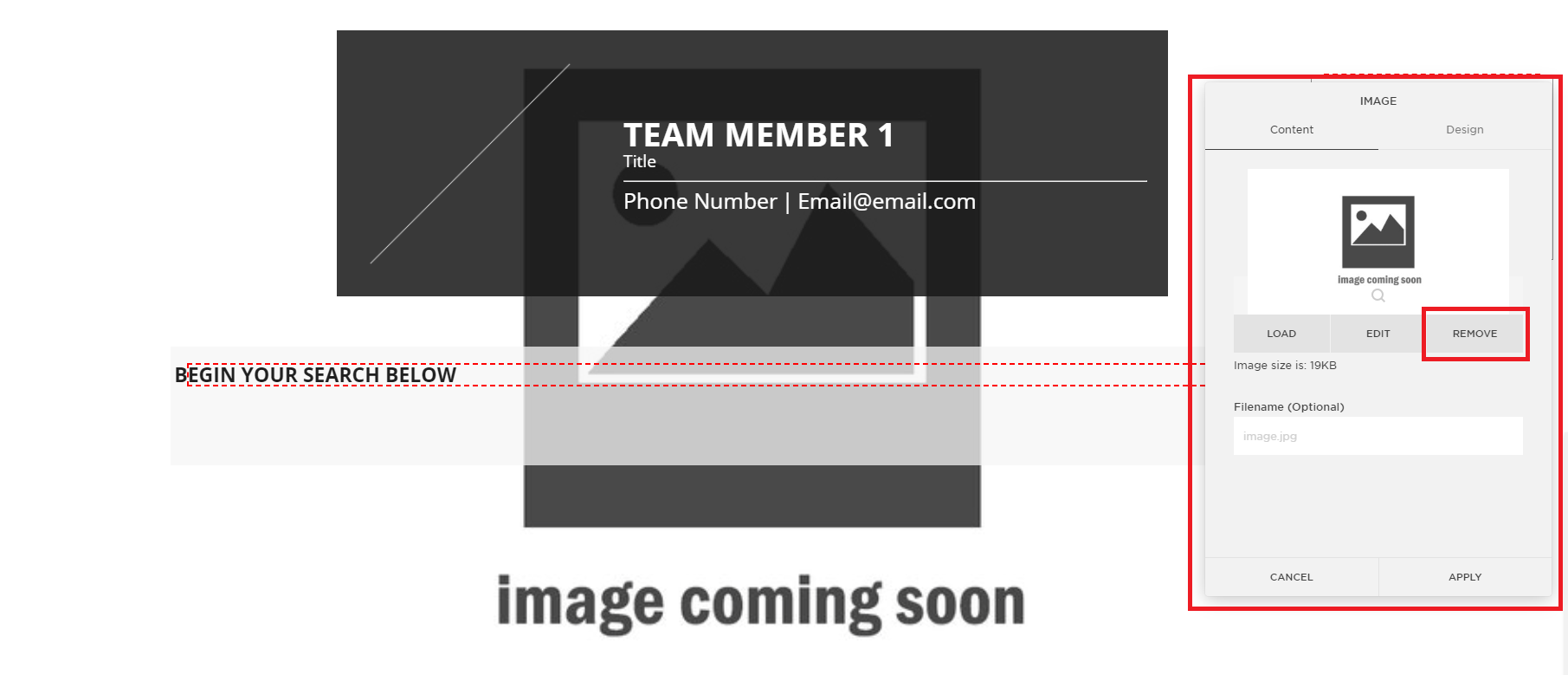 Remove the current image and add a new one similar to how we’ve changed the member’s headshot on prior steps. You can get photos from Shutterstock.com. Simply search for an image based on the primary area of the client.
